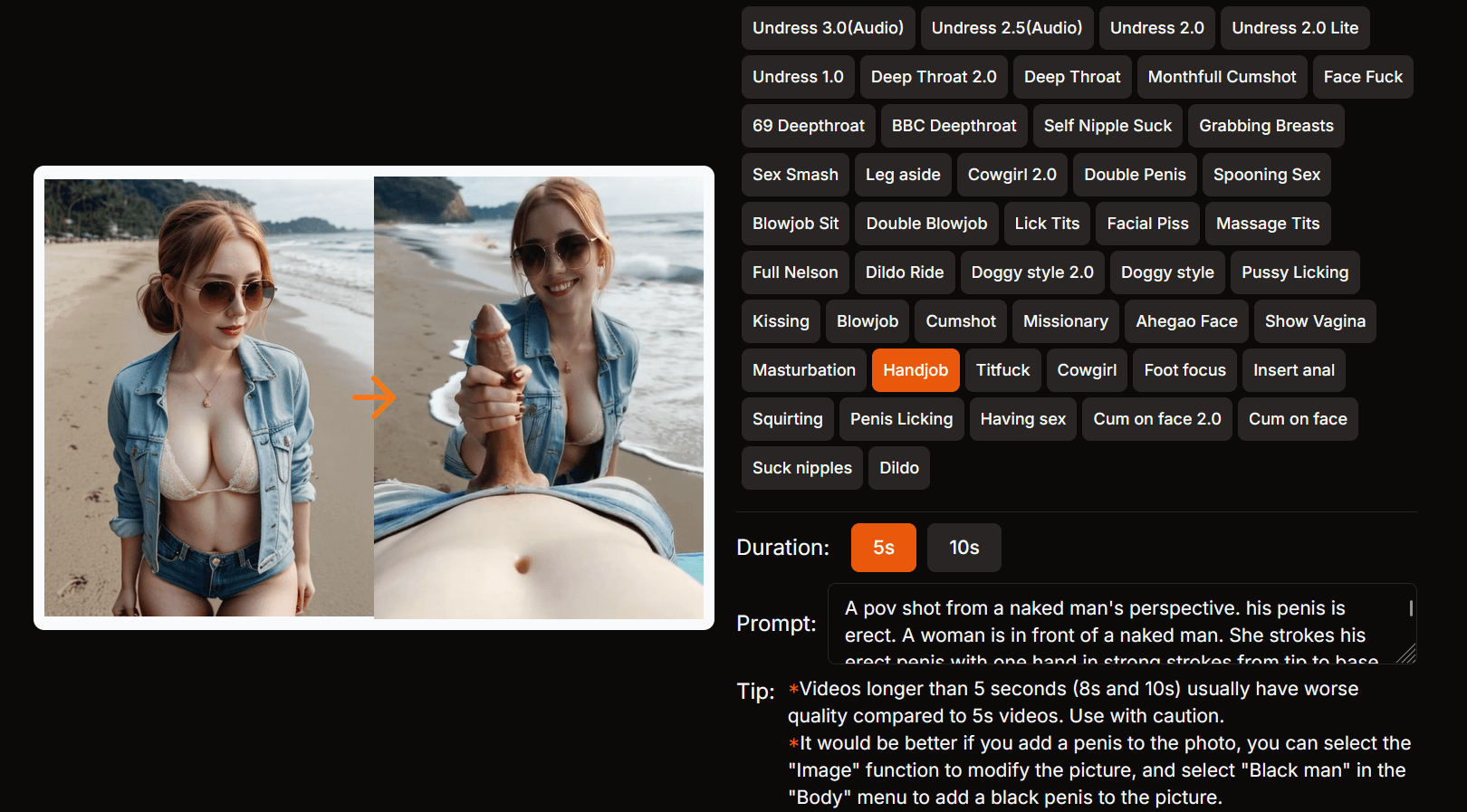 This tool is exclusive for users who want low-effort AI handjob videos and don’t mind the inconsistent realism.